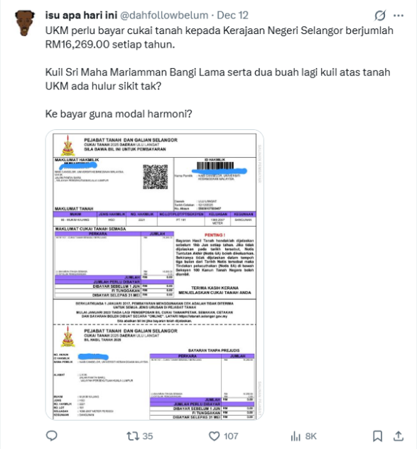 UKM bayar cukai tanah dekat Kerajaan Selangor RM 16K setahun. Kuil haram PERCUMA!