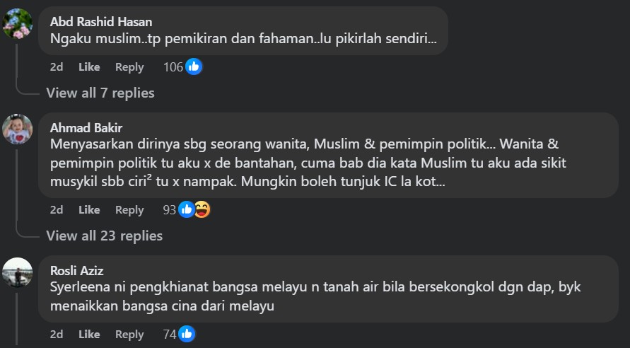 Such distasteful reaction can be gauged from two Facebook posts which reported Syerleena exposing three TikTok accounts – @nowadd_, @cikguirisdelea and @sayapkiri916 – which she claimed had posted content full of false accusations, distortion of facts and hateful narratives targeting her as a woman, a Muslim and a political leader.