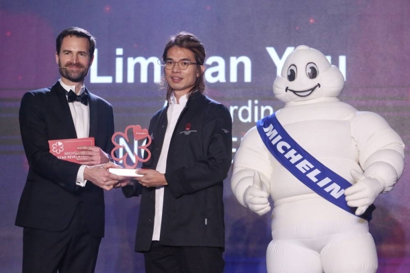 Michelin young chef award winner Lim Yan You from Au Jardin receives the Young Chef Award at the Michelin KL & Penang Stars Revelation presentation in Berjaya Time Square KL Hotel December 13, 2022. — Picture by Choo Choy May