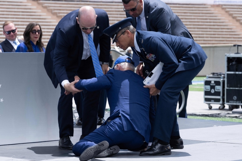 US President Joe Biden is helped up after falling during the graduation ceremony at the United States Air Force Academy, just north of Colorado Springs in El Paso County, Colorado, on June 1, 2023. — AFP pic