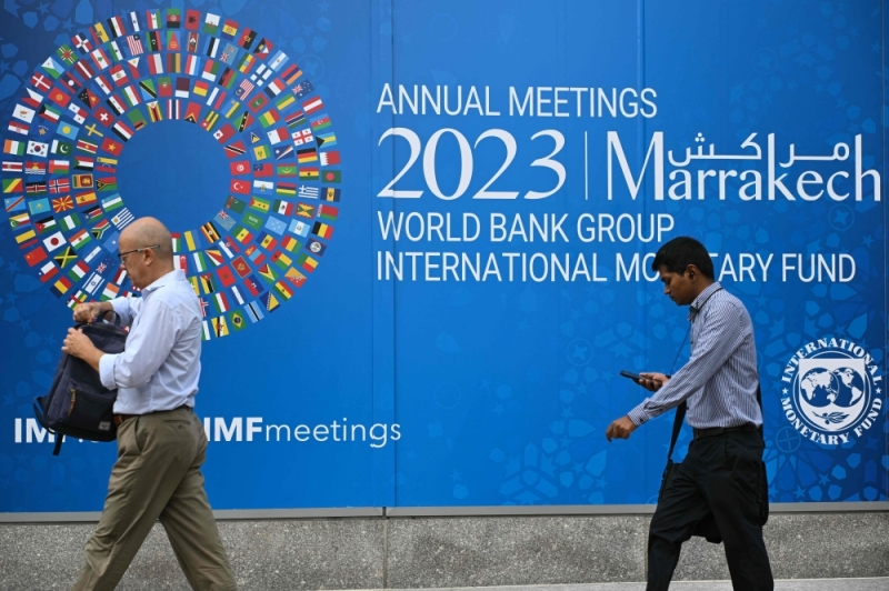 Pedestrians walk past a billboard announcing the World Bank Group and International Monetary Fund annual meetings, on the side of the International Monetary Fund headquarters in Washington, DC, on October 5, 2023. — AFP pic