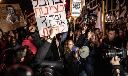Protesters outside Israel’s defence ministry in Tel Aviv on Saturday night demand early elections. Photograph: Anadolu/Getty Images