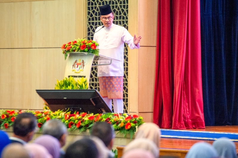 Prime Minister Datuk Seri Anwar Ibrahim, who is also finance minister, delivers his speech during the Finance Ministry's monthly assembly in Putrajaya April 2, 2024. — Picture by Shafwan Zaidon