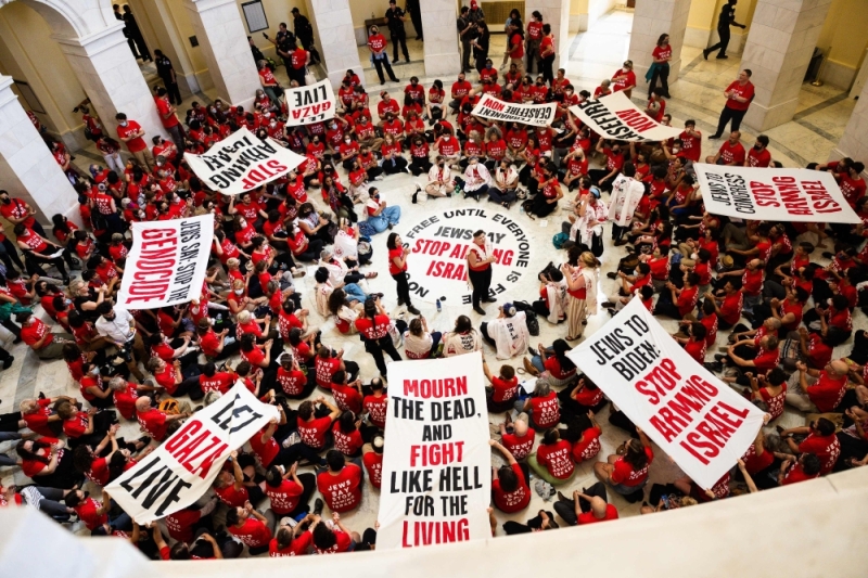 Demonstrators from Jewish Voice For Peace protest the war in Gaza at the Canon House Building on July 23, 2024 in Washington, DC. The protest comes a day before Israeli Prime Minister Benjamin Netanyahu is set to speak before Congress. — AFP pic