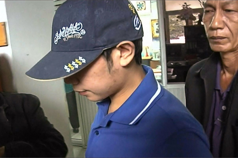 A file photograph show a frame grab from video footage Red Bull heir Vorayuth Yoovidhya (centre) entering Thong Lor police station in Bangkok. — AFP pic