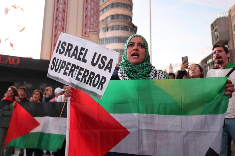Demonstrators hold Palestinian flags during a gathering called in support of Lebanon, in Madrid on September 25, 2024. — AFP pic