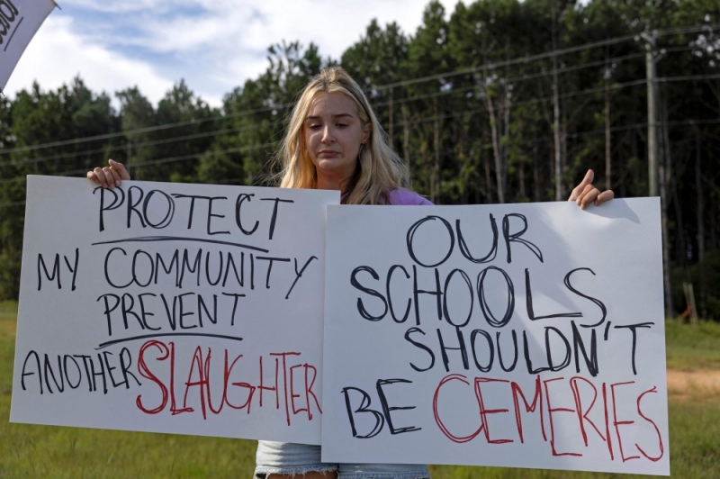 Gretchen Gierlach, a local resident, holds up homemade signs calling for an end to gun violence outside of Apalachee High School in Winder, Georgia yesterday after a shooting took place. — AFP pic