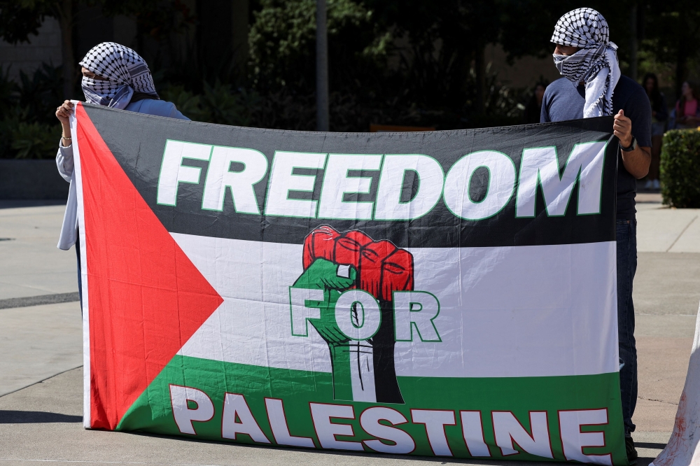 People hold a banner to denounce Israel for what is described as ‘one year of genocide on the people of Gaza’ in a demonstration at the University of California, in the US on October 7, 2024. — Reuters file pic