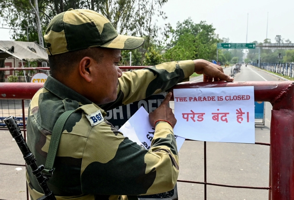 An Indian Border Security Force (BSF) personnel places a poster that reads, ‘The Parade is closed’ atop a barricade as the Beating Retreat ceremony is closed for visitors at the India and Pakistan Wagah border post, near Amritsar, on May 7, 2025, as border tensions rise following Indian strikes in Pakistan. — Reuters pic