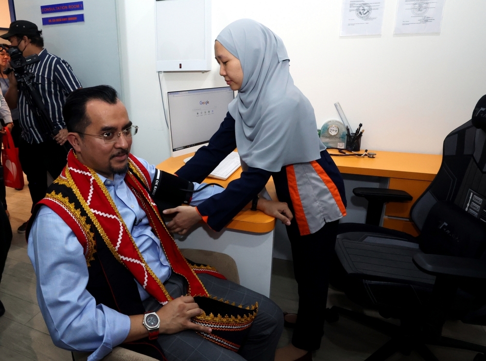 Majlis Amanah Rakyat (MARA) chairman Datuk Asyraf Wajdi Dusuki undergoing a medical check-up during the launch of the U.N.I Klinik Metrocity clinic. — Bernama pic