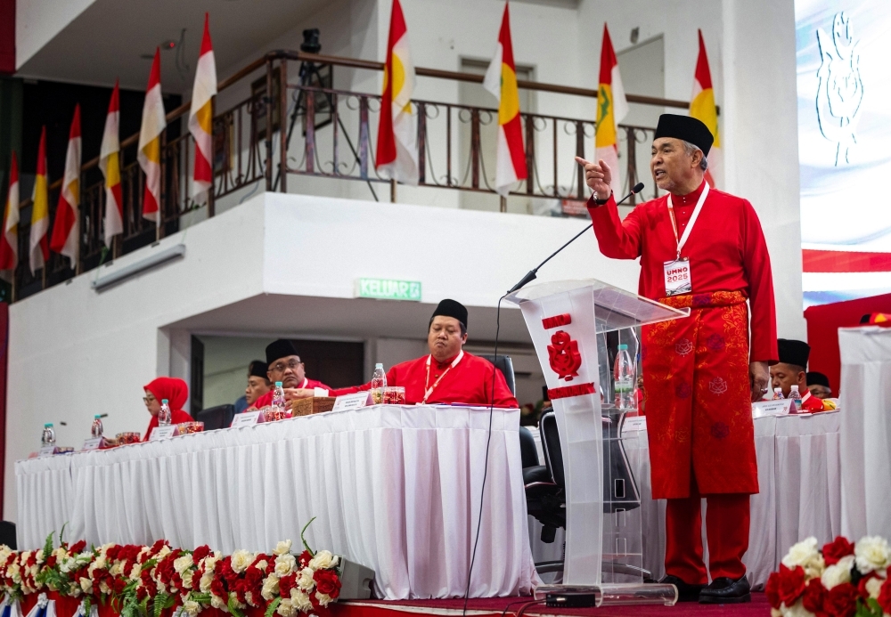 Deputy Prime Minister and Umno president Datuk Seri Ahmad Zahid Hamidi delivers his speech while officiating the 2025 Bagan Datuk Umno Division Delegates Meeting at the Bagan Datuk Umno Complex today.— Bernama pic