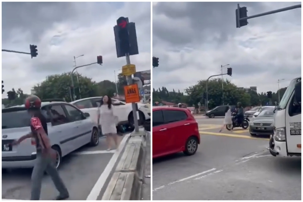 Screengrab of the video showing the foreign woman exiting her vehicle and attacking bystanders with a knife in Kajang.
