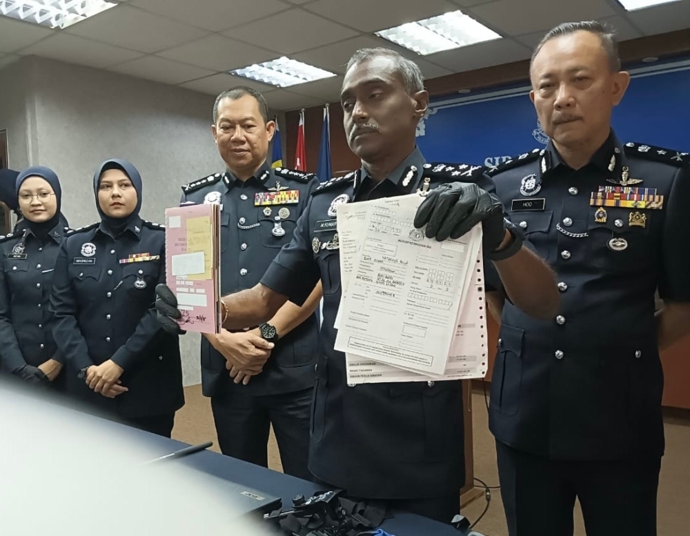 Bukit Aman Criminal Investigation Department (CID) director Datuk M. Kumar with documents seized from the suspects during the operation August 29, 2025 — Picture by Ben Tan