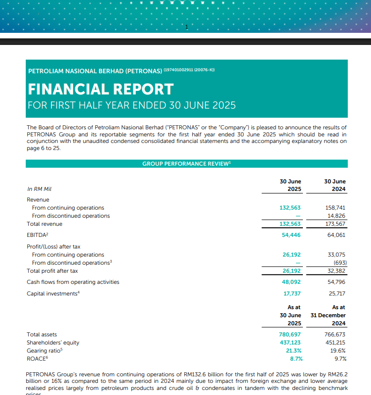 Petronas financial report for the first half of the year to June 30, 2025 is out. Revenue has declined from RM 173.567 bil in 2024 to RM 132.563 bil in 2025. Profit after tax have decreased from RM 32.382 bil in 2024 to RM 26.192 bil in 2025, for the first semester.