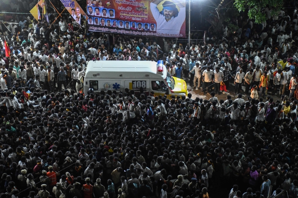 An ambulance carrying victims makes its way through the crowd after a stampede during a political rally in Karur district, Tamil Nadu, India, September 27, 2025. The stampede killed 39 people after thousands waited for hours in the heat to see actor-turned-politician Vijay, officials said. — AFP pic