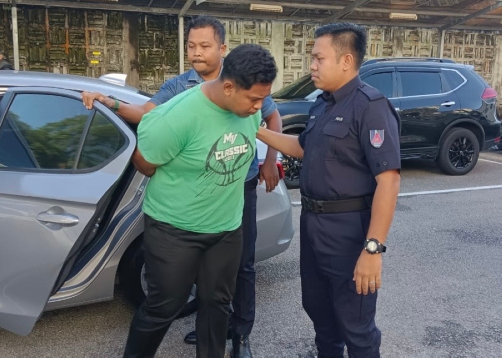 The accused Muhammad Faiz Aresah being escorted by policemen to the Johor Bahru Sessions Court today where he was charged for child abuse by using a hot iron to his niece’s arm. Oct 2, 2025. — Picture by Ben Tan