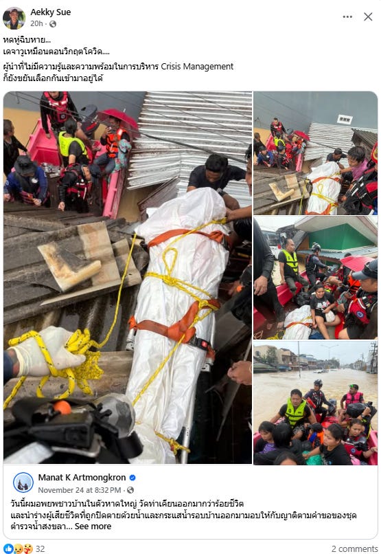 Since my article on the Hat Yai floods yesterday, there was a significant increase in the water levels putting many lives in danger. Many one story homes in Hat Yai are now completely submerged, while families in two story homes are now sitting on top floor balconies waiting for food and rescue. Many people in condominiums have exhausted stored foods and haven’t eaten for days. Shops and restaurants have been completely overwhelmed by the flood waters.