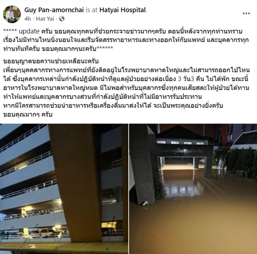 There was a major tragedy at Hat Yai Hospital. The generators on the ground floor were flooded cutting out off electricity. There are unconfirmed reports of people on ICU passing away. Patients are being moved by helicopter to other hospitals. The hospital flooded on the ground floor is basically out of commission.
