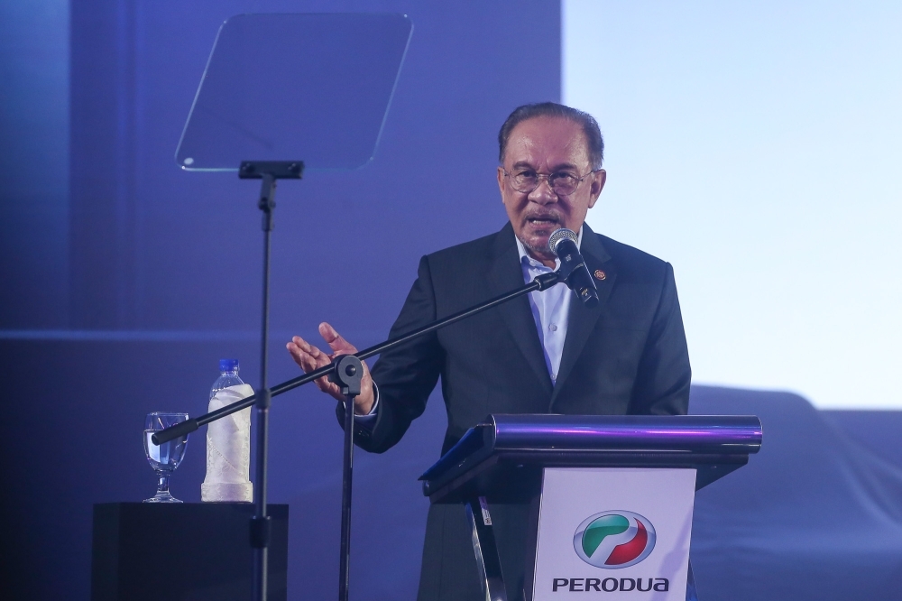 Prime Minister Datuk Seri Anwar Ibrahim speaks during the launch of the Perodua EV at MITI Tower in Kuala Lumpur December 1, 2025. — Picture by Yusof Mat Isa