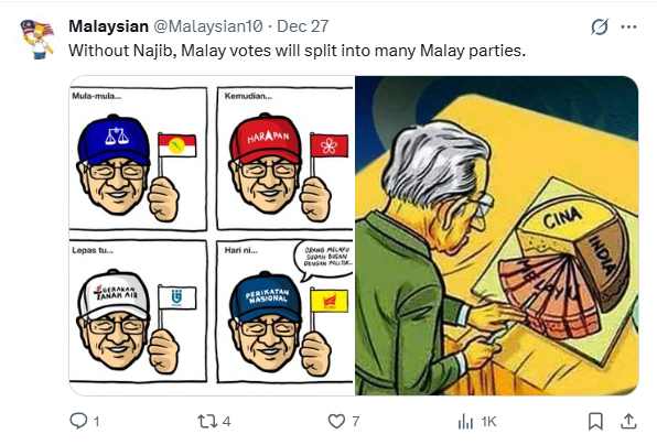 A netizen recently drew quite the amount of attention for pointing out on a post on X that Najib’s incarceration means the Malay votes will all go to PN.