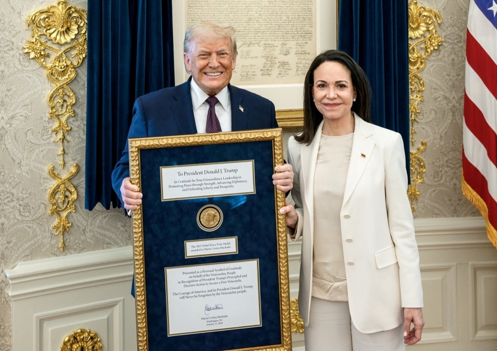 Venezuelan opposition leader Maria Corina Machado gives away her Nobel Peace Prize medal to US President Donald Trump in Washington DC on January 15, 2026. — White House handout pic