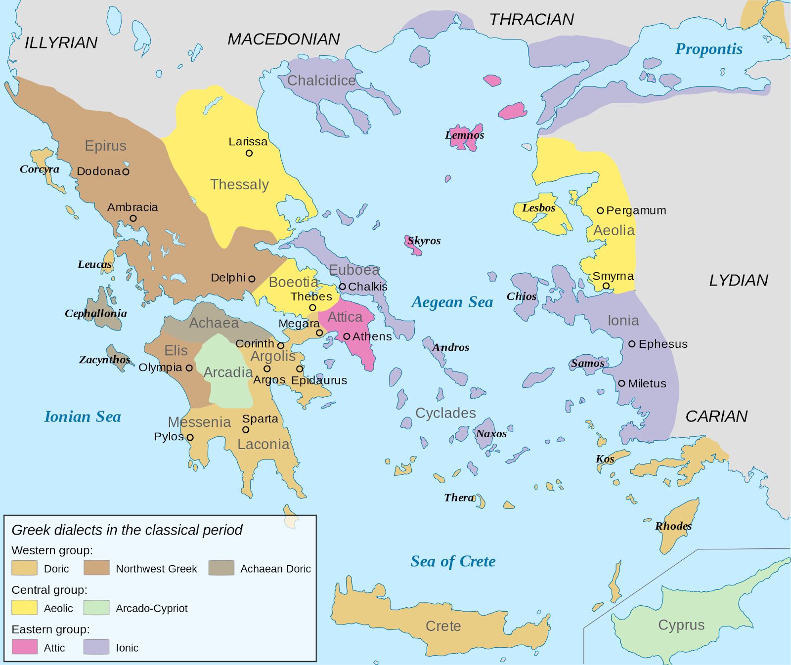 (b) Actually Greek script hails from its Phoenician origin - it modified parts of the Phoenician alphabet to use as its written script. Historians say today's Greek alphabet was the Ionian version (Ionic being part of the ancient Greek world on today's Turkey or Anatolia - see dull blue colour). T'was conceived around 770 to 750 BCE.