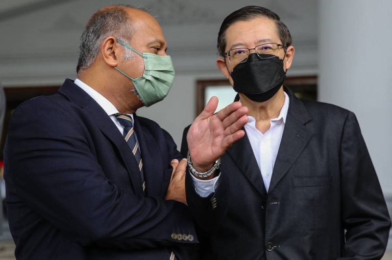 Former Penang chief minister Lim Guan Eng (right) speaks with his lawyer Gobin Singh Deo at the Kuala Lumpur High Court June 24, 2022. — Picture by Yusof Mat Isa