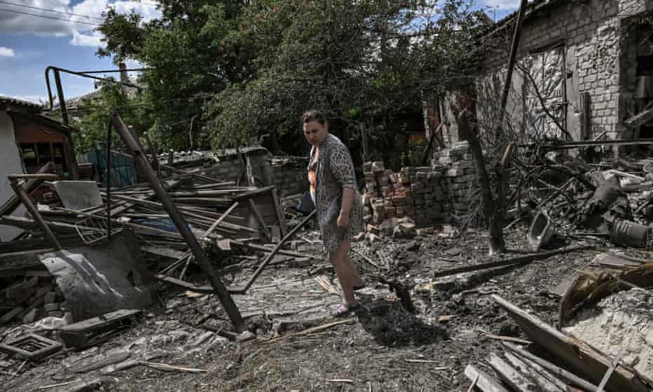A woman stands in the yard of her destroyed house in the city of Lysychansk. Photograph: Aris Messinis/AFP/Getty Images