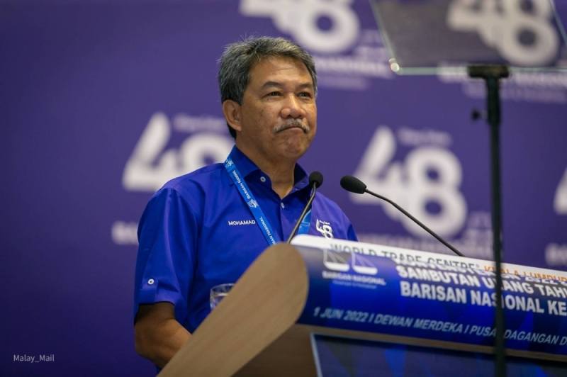 Datuk Seri Mohamad Hasan gives a speech at the Kuala Lumpur World Trade Centre during the Barisan Nasional 2022 Convention June 1, 2022. — Picture by Devan Manuel