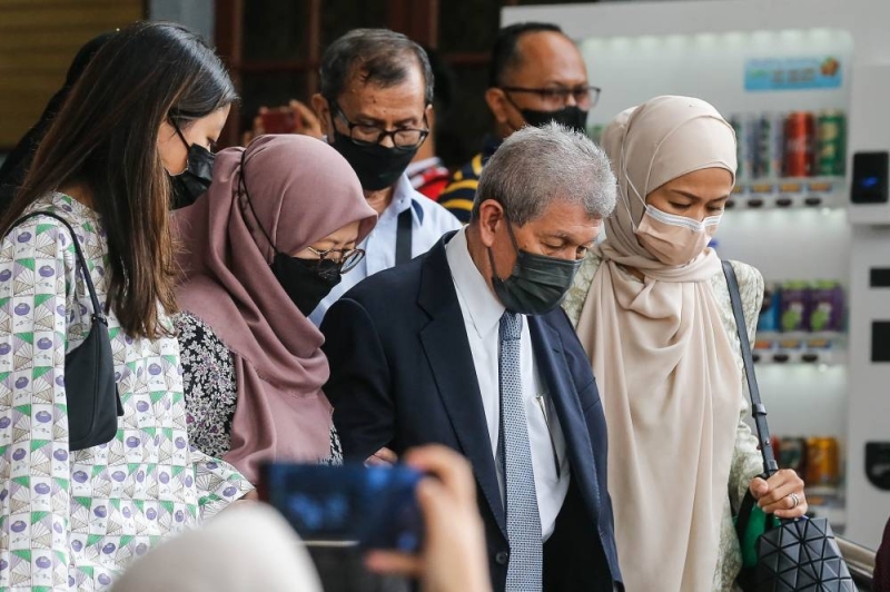 Former Boustead Heavy Industries Corp Managing Director, Tan Sri Ahmad Ramli Mohd Nor is pictured escorted out by his family members after he was charged over the LCS scandal at Kuala Lumpur High Court, August 16, 2022. — Picture by Sayuti Zainudin