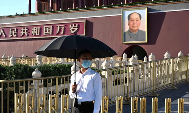 A security guard in front of the portrait of late Communist leader Mao Zedong at Tiananmen Gate in Beijing. Xi Jinping is expected to be given a third term as China’s leader. Photograph: Yuxuan Zhang/AFP/Getty Images