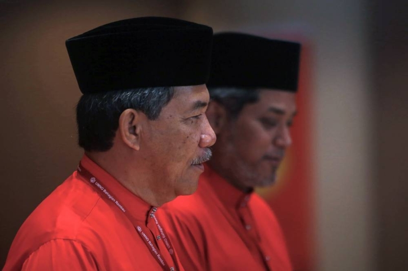 (From left) Umno deputy president Datuk Seri Mohamad Hasan and Khairy Jamaluddin attend the Rembau Umno Division delegates meeting in Seremban October 16, 2022. — Bernama pic