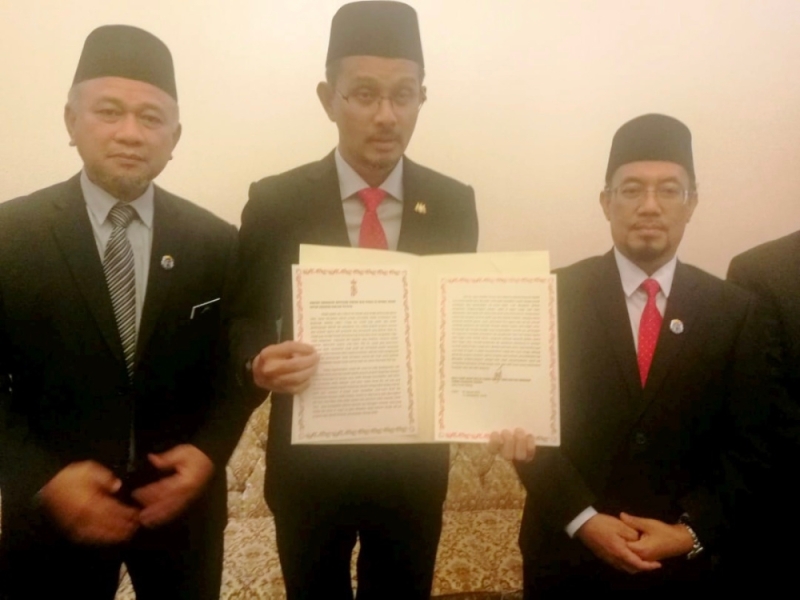 Islamic Religious Affairs Committee chairman Mohd Fared Mohd Khalid (centre) holds up the Johor Crown Prince’s order in Bukit Timbalan, Johor Baru on Jan 17, 2023. — Picture by Ben Tan