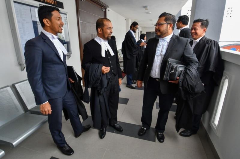 Lawyers representing Gua Musang Parliamentary candidate (PAS) Datuk Mohd Azizi Abu Naim, Wan Rohimi Wan Daud (second left) along with a line of lawyers present at the outcome of the preliminary objection proceedings of the Gua Musang Parliamentary petition at the High Court February 26, 2023. — Bernama pic