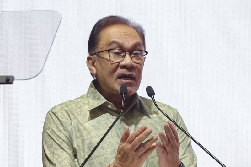 Prime Minister Datuk Seri Anwar Ibrahim speaks during the launch of the Housewife Social Security Scheme and MyFutureJobs 2023 Career Carnival in Kuala Lumpur February 11, 2023. ― Picture by Yusof Mat Isa