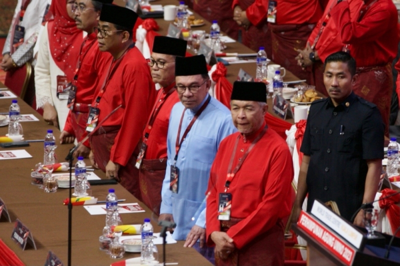 Clad in a blue traditional baju melayu, Anwar stood out among the seas Umno delegates dressed in red as he marched alongside his deputies Datuk Seri Ahmad Zahid Hamidi, who is also Umno president, and Datuk Seri Fadillah Yusof.
