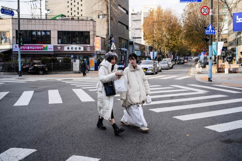 File of two women walking across a road in the Jongno district of Seoul on December 4, 2023. — AFP pic