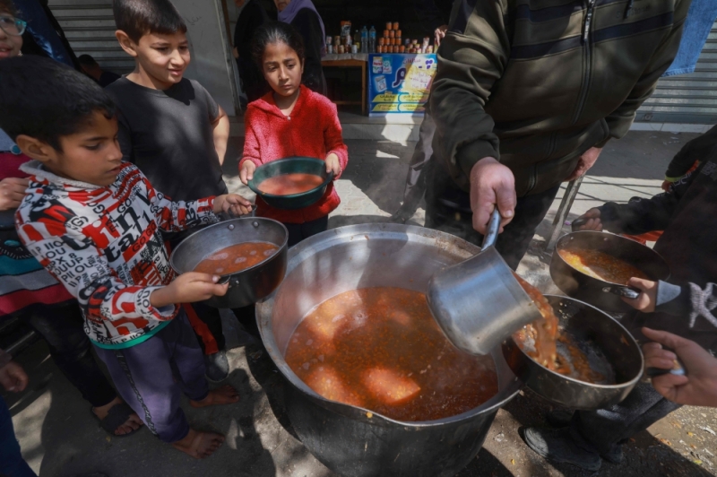 Palestinian children receive cooked food rations as part of a volunteer youth initiative in Rafah. — AFP pic