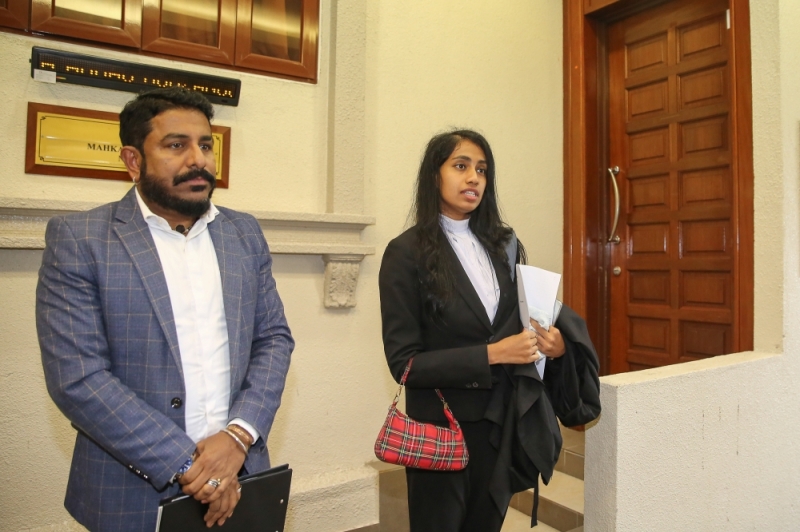 Chairman of the Indira Ghandi Action Team (Ingat), Arun Dorasamy, with lawyer Pavitra Loganathan (right), speak to reporters at the Kuala Lumpur High Court, June 27, 2024. — Picture by Yusof Mat Isa