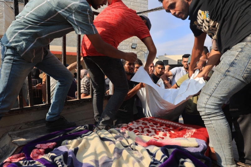 Relatives load a victim onto the back of a truck to be taken for burial outside a hospital in Deir al-Balah, in the central Gaza Strip. — AFP pic