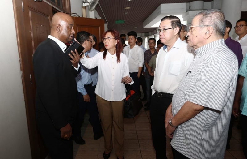 (front, from right) Tan Sri Lim Kit Siang, Lim Guan Eng and Teresa Kok speak to their lawyer Datuk Sankara Nair outside the courtroom before the trial in their defamation suit against Kepala Batas MP Siti Mastura Muhammad at the Penang High Court September 3, 2024. — Picture by Opalyn Mok