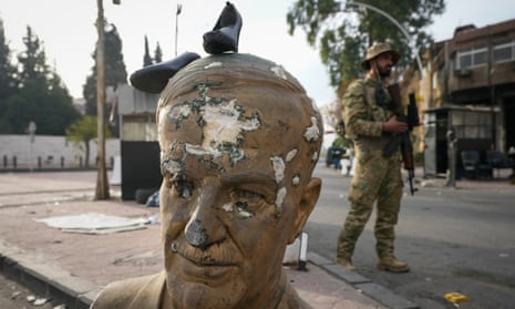 An opposition fighter in military uniform stands next to a broken bust of the late Syrian President Hafez Assad in Damascus. Photograph: Hussein Malla/AP
