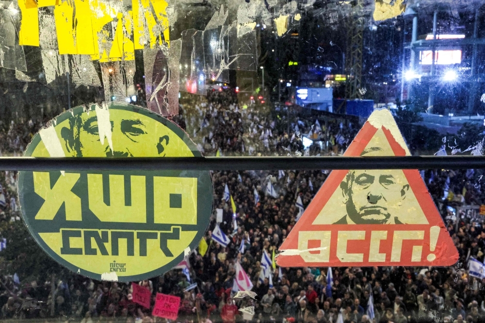 Stickers critical of Israeli Prime Minister Benjamin Netanyahu are pictured behind the glass of a window above demonstrators gathering outside Israeli Defence Ministry headquarters Tel Aviv on March 22, 2025. — AFP pic
