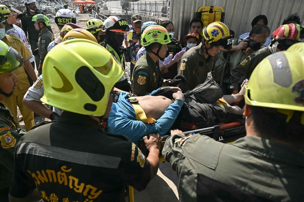 An injured man is rescued at a construction site where a building collapsed in Bangkok on March 28, 2025. — AFP pic