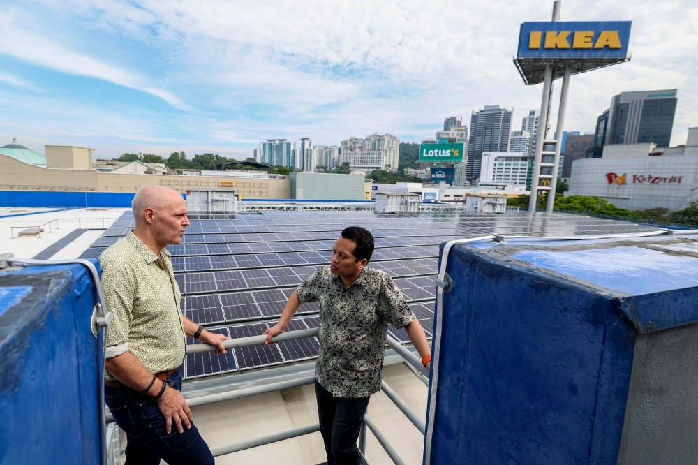 Minister of Natural Resources and Environmental Sustainability Nik Nazmi Nik Ahmad (right) observes the solar panels installed on the rooftop during the inauguration of the Ikea Damansara Solar Panel Commissioning in conjunction with Earth Day. — Bernama pic