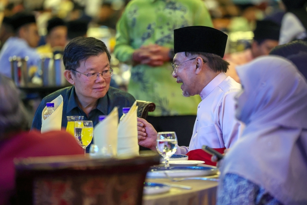 Penang Chief Minister Chow Kon Yeow and Prime Minister Datuk Seri Anwar Ibrahim chat during the Penang Aidilfitri Madani 2025 Celebration Ceremony in Seberang Perai April 12, 2025. — Bernama pic
