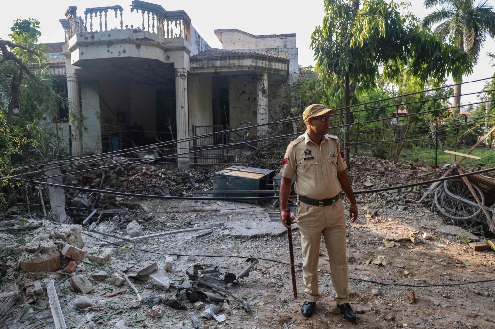 An Indian police personnel stands outside a house that was damaged by Pakistani artillery shelling in Jammu on May 10, 2025. — AFP pic