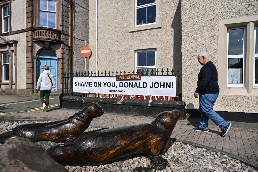 The banner hangs in front of a shop in the harbour of Stornoway, the island’s largest town, and reads in bold black letters: “Shame on you, Donald John! #democracy”.