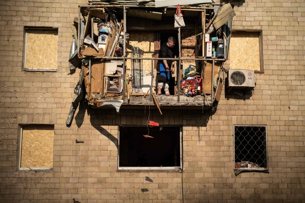 A man stands on a damaged balcony following Russian drone strike in Kharkiv today. — AFP pic