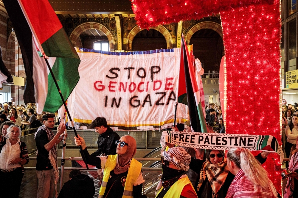 Demonstrators hold slogans reading ‘Stop Gensode in Gaza’ and ‘Free Palestine’ during a pro-Palestinian demonstration at the Central Station in Amsterdam, the Netherlands on July 31, 2025. — AFP pic